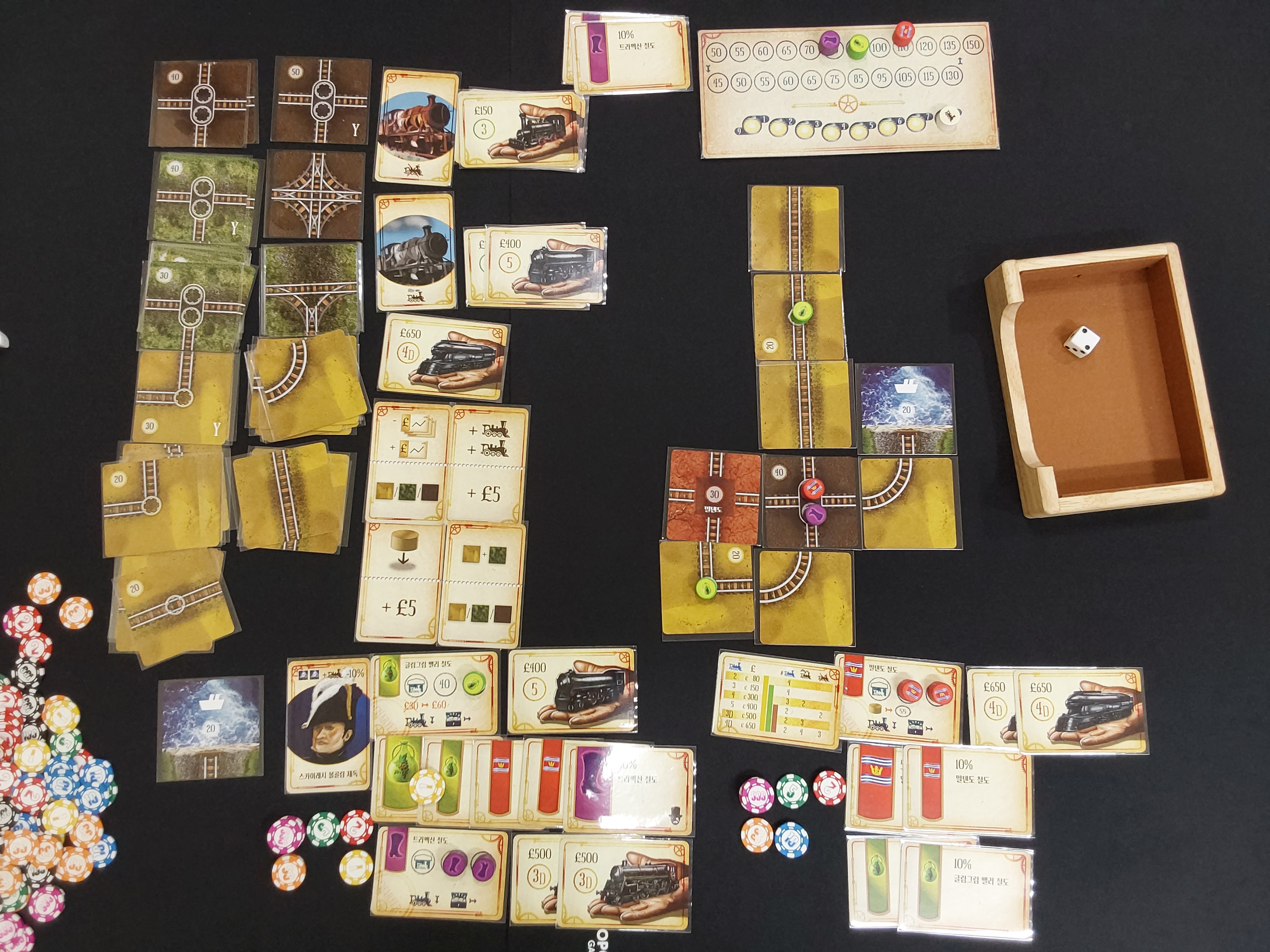 걸리버가 밀덴도 철도회사(회사 주가가 55파운드에서 시작)를 랜덤으로 가져갔다. 나는 글림그림 밸리 철도회사(소유주 시작자금 60파운드)를 선택하고, 캐릭터 카드는 스카이레시 볼골람 제독(기차구임 50% 할인, 항구 타일)을 선택했다.