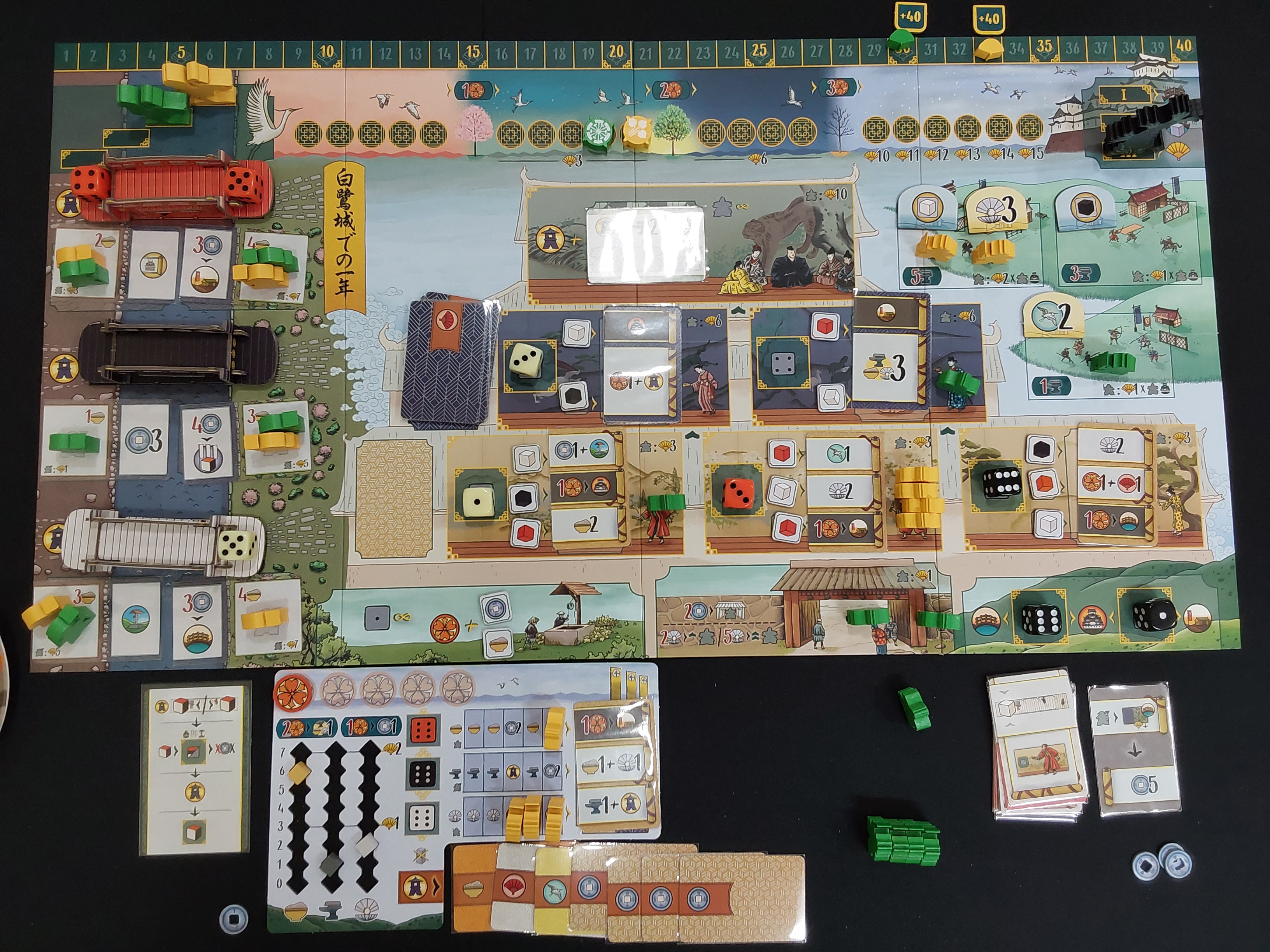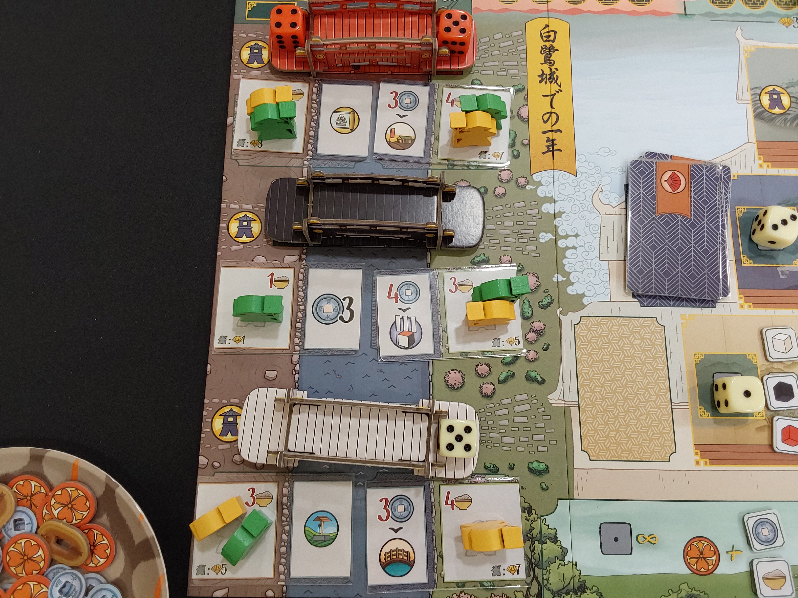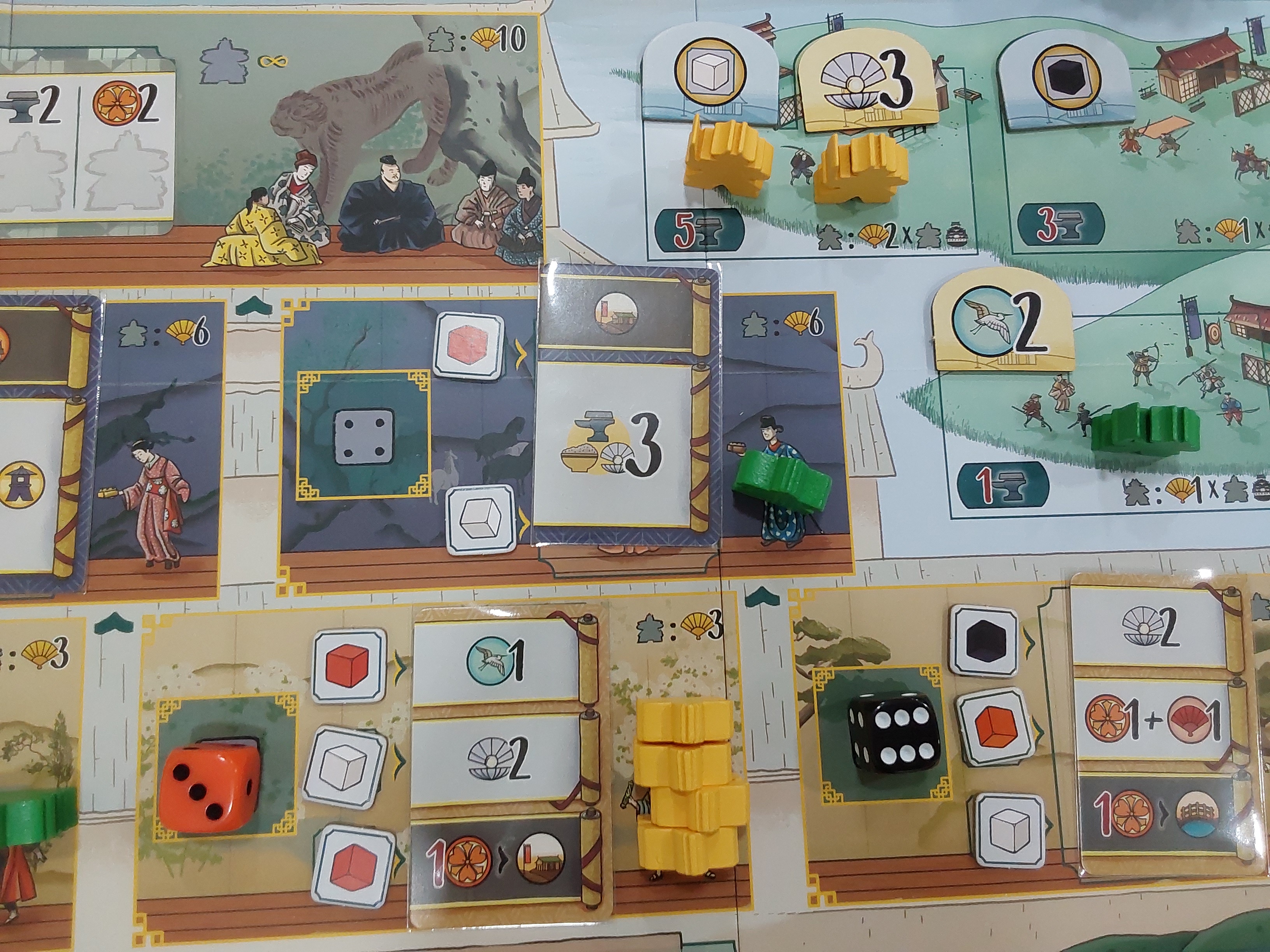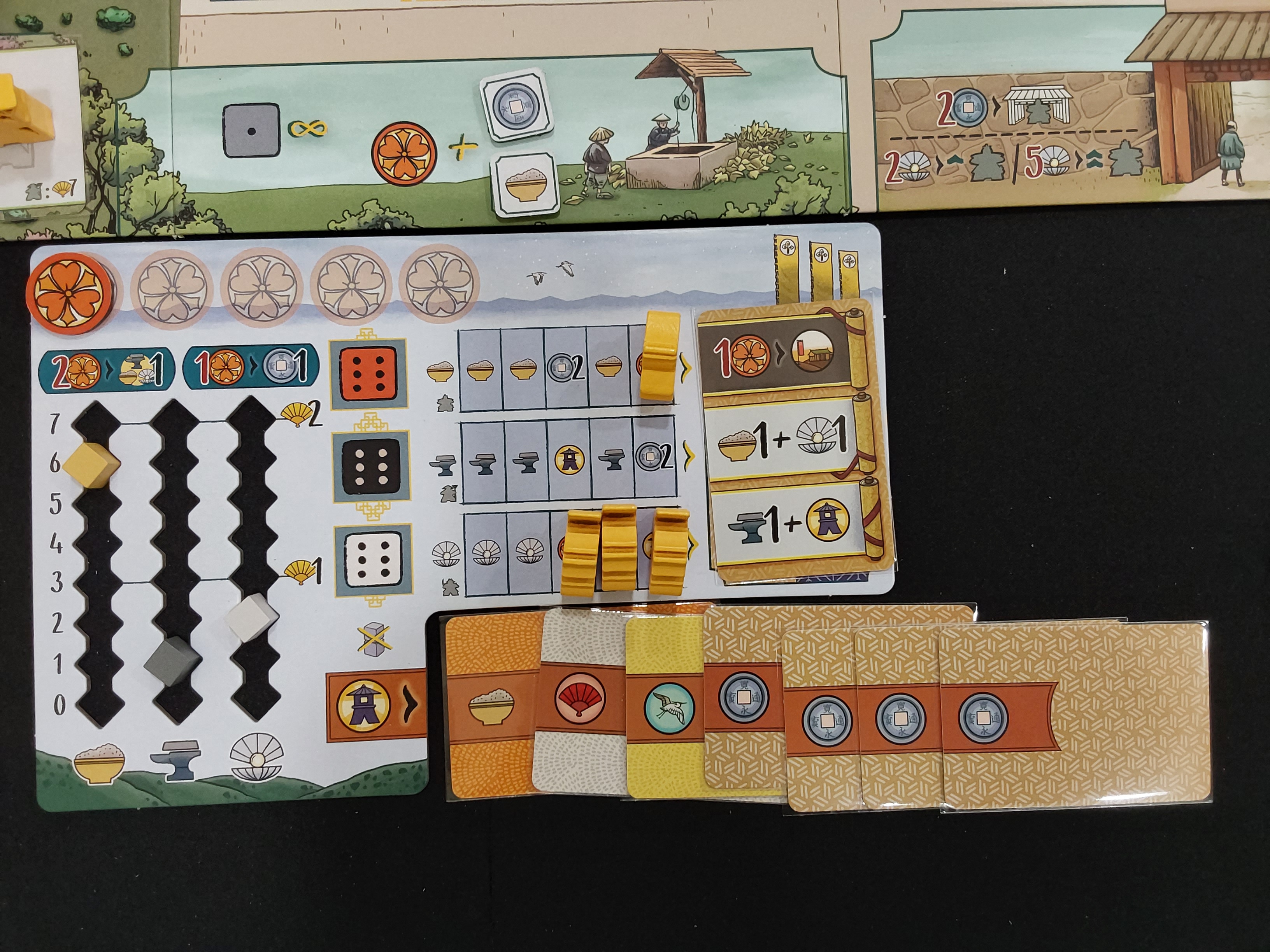 초기 자원으로 점수 법령 카드와 음식 1개, 철 1개, 자개 1개, 동전 2개, 다이묘 문장 2개를 받았다.