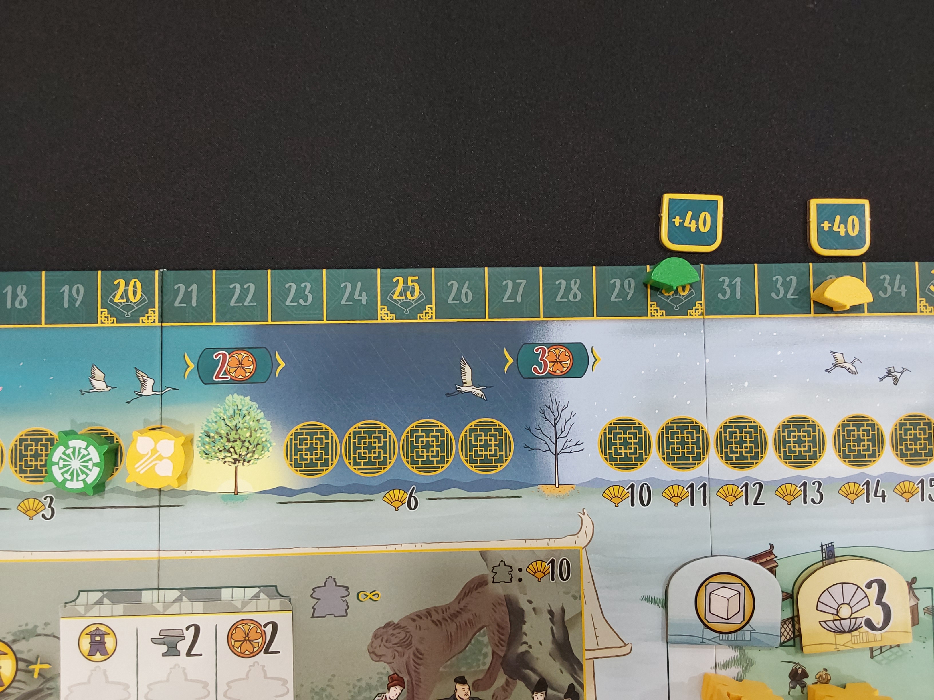 등불 행동을 많이 하다 보니 등불에서 시간 트랙 1칸 전진을 많이 수행하여 3 라운드에서 처음으로 경쟁자를 추월하였다.